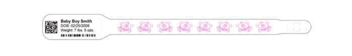 シールで留めるタイプのリストバンド。一度剥がすと元の通り貼る事が出来ないシールを利用。新生児取り違えの防止に。日帰り~1週間程度の短期使用に。